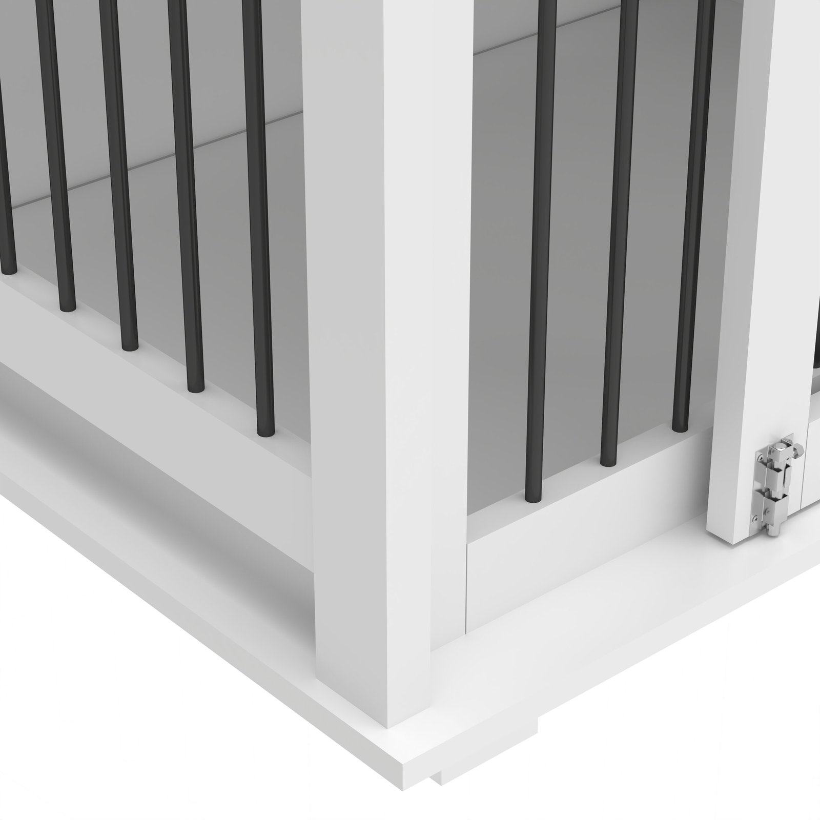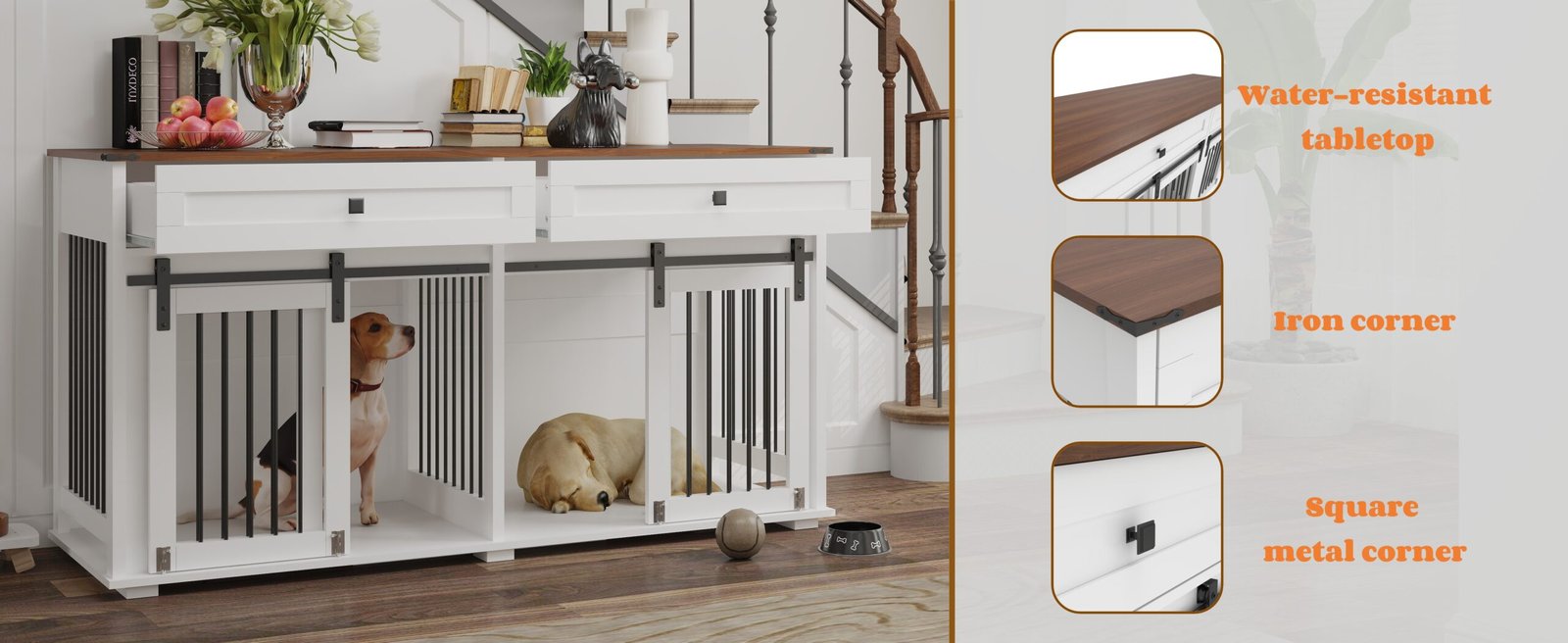 The corners of the table are wrapped with metal corner pieces, which makes the dog cage more beautiful and protects the family and dog